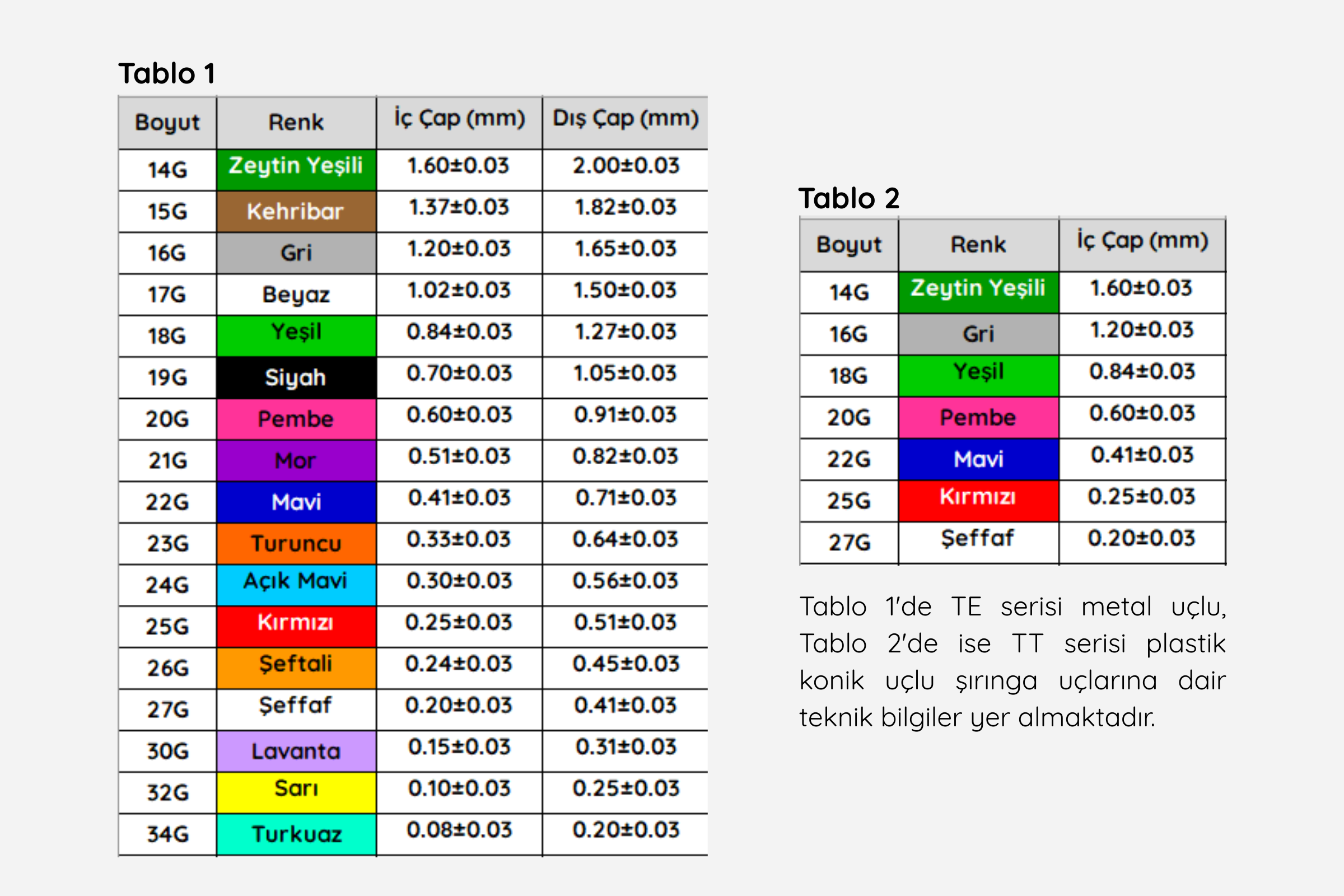 C3 Teknoloji olarak, dozajlama süreçlerinizde ihtiyacınıza özel çözümler sunuyoruz. Geniş ürün yelpazemizde yer alan TE Serisi metal şırınga uçları, renk kodlamalı, farklı iç çap ve uzunluk seçenekleriyle yüksek hassasiyetli uygulamalar için idealdir.